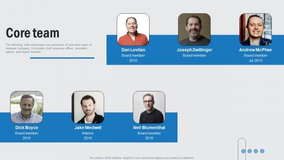 The following slide showcases key personnel of executive team of footwear company. It includes chief executive officer, president, advisor and board member. There are so many reasons you need a Core Team Footwear Company Funding Elevator Pitch Deck Formats Pdf. The first reason is you can not spend time making everything from scratch, Thus, Slidegeeks has made presentation templates for you too. You can easily download these templates from our website easily. The following slide showcases key personnel of executive team of footwear company. It includes chief executive officer, president, advisor and board member.