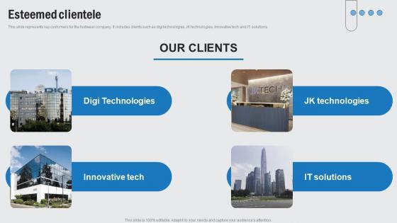 This slide represents key customers for the footwear company. It includes clients such as digi technologies, JK technologies, Innovative tech and IT solutions. Do you have to make sure that everyone on your team knows about any specific topic I yes, then you should give Esteemed Clientele Footwear Company Funding Elevator Pitch Deck Rules Pdf a try. Our experts have put a lot of knowledge and effort into creating this impeccable Esteemed Clientele Footwear Company Funding Elevator Pitch Deck Rules Pdf. You can use this template for your upcoming presentations, as the slides are perfect to represent even the tiniest detail. You can download these templates from the Slidegeeks website and these are easy to edit. So grab these today This slide represents key customers for the footwear company. It includes clients such as digi technologies, JK technologies, Innovative tech and IT solutions.