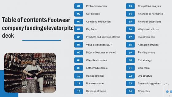 This Table Of Contents Footwear Company Funding Elevator Pitch Deck Background Pdf is perfect for any presentation, be it in front of clients or colleagues. It is a versatile and stylish solution for organizing your meetings. The Table Of Contents Footwear Company Funding Elevator Pitch Deck Background Pdf features a modern design for your presentation meetings. The adjustable and customizable slides provide unlimited possibilities for acing up your presentation. Slidegeeks has done all the homework before launching the product for you. So, do not wait, grab the presentation templates today Our Table Of Contents Footwear Company Funding Elevator Pitch Deck Background Pdf are topically designed to provide an attractive backdrop to any subject. Use them to look like a presentation pro.