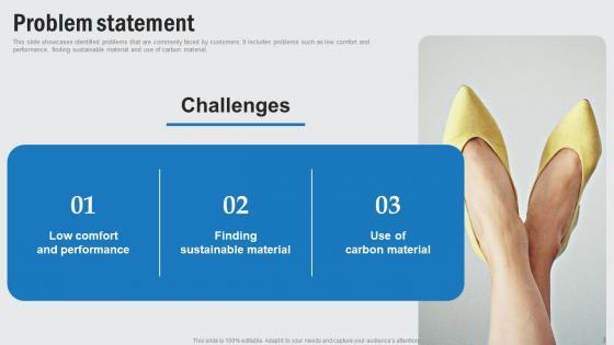 This slide showcases identified problems that are commonly faced by customers. It includes problems such as low comfort and performance, finding sustainable material and use of carbon material. Make sure to capture your audiences attention in your business displays with our gratis customizable Problem Statement Footwear Company Funding Elevator Pitch Deck Introduction Pdf. These are great for business strategies, office conferences, capital raising or task suggestions. If you desire to acquire more customers for your tech business and ensure they stay satisfied, create your own sales presentation with these plain slides. This slide showcases identified problems that are commonly faced by customers. It includes problems such as low comfort and performance, finding sustainable material and use of carbon material.