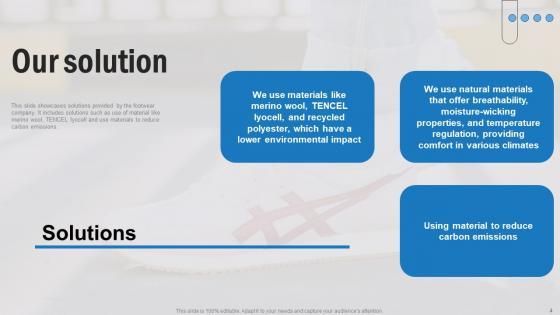 This slide showcases solutions provided by the footwear company. It includes solutions such as use of material like merino wool, TENCEL lyocell and use materials to reduce carbon emissions. Crafting an eye-catching presentation has never been more straightforward. Let your presentation shine with this tasteful yet straightforward Our Solution Footwear Company Funding Elevator Pitch Deck Slides Pdf template. It offers a minimalistic and classy look that is great for making a statement. The colors have been employed intelligently to add a bit of playfulness while still remaining professional. Construct the ideal Our Solution Footwear Company Funding Elevator Pitch Deck Slides Pdf that effortlessly grabs the attention of your audience Begin now and be certain to wow your customers This slide showcases solutions provided by the footwear company. It includes solutions such as use of material like merino wool, TENCEL lyocell and use materials to reduce carbon emissions.
