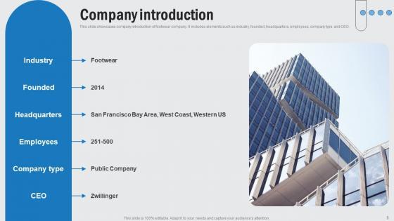 This slide showcases company introduction of footwear company. It includes elements such as industry, founded, headquarters, employees, company type and CEO. Slidegeeks is one of the best resources for PowerPoint templates. You can download easily and regulate Company Introduction Footwear Company Funding Elevator Pitch Deck Structure Pdf for your personal presentations from our wonderful collection. A few clicks is all it takes to discover and get the most relevant and appropriate templates. Use our Templates to add a unique zing and appeal to your presentation and meetings. All the slides are easy to edit and you can use them even for advertisement purposes. This slide showcases company introduction of footwear company. It includes elements such as industry, founded, headquarters, employees, company type and CEO.