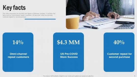 This slide showcases the key facts and figures of footwear company. It includes key facts such as Omni-channel repeat customers, US pre-covid store success and customer repeat for second purchase. Find highly impressive Key Facts Footwear Company Funding Elevator Pitch Deck Mockup Pdf on Slidegeeks to deliver a meaningful presentation. You can save an ample amount of time using these presentation templates. No need to worry to prepare everything from scratch because Slidegeeks experts have already done a huge research and work for you. You need to download Key Facts Footwear Company Funding Elevator Pitch Deck Mockup Pdf for your upcoming presentation. All the presentation templates are 100 percent editable and you can change the color and personalize the content accordingly. Download now This slide showcases the key facts and figures of footwear company. It includes key facts such as Omni-channel repeat customers, US pre-covid store success and customer repeat for second purchase.