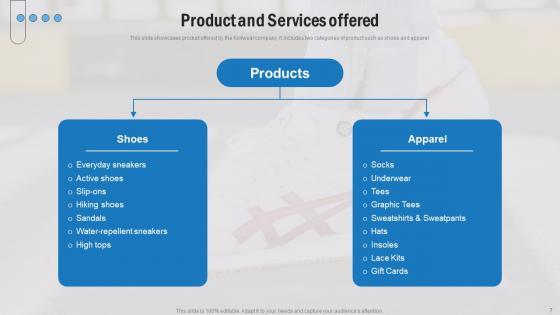 This slide showcases product offered by the footwear company. It includes two categories of product such as shoes and apparel. Formulating a presentation can take up a lot of effort and time, so the content and message should always be the primary focus. The visuals of the PowerPoint can enhance the presenters message, so our Product And Services Offered Footwear Company Funding Elevator Pitch Deck Designs Pdf was created to help save time. Instead of worrying about the design, the presenter can concentrate on the message while our designers work on creating the ideal templates for whatever situation is needed. Slidegeeks has experts for everything from amazing designs to valuable content, we have put everything into Product And Services Offered Footwear Company Funding Elevator Pitch Deck Designs Pdf This slide showcases product offered by the footwear company. It includes two categories of product such as shoes and apparel.