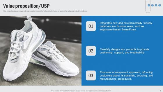 This slide showcases unique selling propositions of solution offered by footwear company differentiates product from others. Welcome to our selection of the Value Proposition Usp Footwear Company Funding Elevator Pitch Deck Inspiration Pdf. These are designed to help you showcase your creativity and bring your sphere to life. Planning and Innovation are essential for any business that is just starting out. This collection contains the designs that you need for your everyday presentations. All of our PowerPoints are 100 percent editable, so you can customize them to suit your needs. This multi-purpose template can be used in various situations. Grab these presentation templates today This slide showcases unique selling propositions of solution offered by footwear company differentiates product from others.