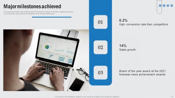 This slide represents major achievements for footwear company. It includes milestones such as conversion rate, sales growth and footwear news achievement award. If your project calls for a presentation, then Slidegeeks is your go-to partner because we have professionally designed, easy-to-edit templates that are perfect for any presentation. After downloading, you can easily edit Major Milestones Achieved Footwear Company Funding Elevator Pitch Deck Topics Pdf and make the changes accordingly. You can rearrange slides or fill them with different images. Check out all the handy templates This slide represents major achievements for footwear company. It includes milestones such as conversion rate, sales growth and footwear news achievement award.