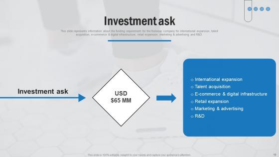 This slide represents information about the funding requirement for the footwear company for international expansion, talent acquisition, e-commerce and digital infrastructure, retail expansion, marketing and advertising and R and D. Whether you have daily or monthly meetings, a brilliant presentation is necessary. Investment Ask Footwear Company Funding Elevator Pitch Deck Diagrams Pdf can be your best option for delivering a presentation. Represent everything in detail using Investment Ask Footwear Company Funding Elevator Pitch Deck Diagrams Pdf and make yourself stand out in meetings. The template is versatile and follows a structure that will cater to your requirements. All the templates prepared by Slidegeeks are easy to download and edit. Our research experts have taken care of the corporate themes as well. So, give it a try and see the results. This slide represents information about the funding requirement for the footwear company for international expansion, talent acquisition, e-commerce and digital infrastructure, retail expansion, marketing and advertising and R and D.