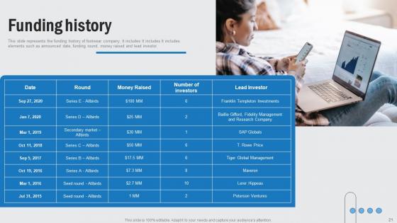 This slide depicts the higher-quality products that the consumer receives as a result of the new technology. It contains information such as a product picture, sizing specifications, and customer feedback, among other things. Deliver an awe inspiring pitch with this creative clothing business startup capital raising solution offered by the footwear company designs pdf bundle. Topics like technology, product, customers, quality can be discussed with this completely editable template. It is available for immediate download depending on the needs and requirements of the user.