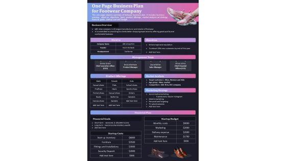 Here we present the One Page Business Plan For Footwear Company PDF Document PPT Template. This One-pager template includes everything you require. You can edit this document and make changes according to your needs it offers complete freedom of customization. Grab this One Page Business Plan For Footwear Company PDF Document PPT Template Download now. Our One Page Business Plan For Footwear Company PDF Document PPT Template are topically designed to provide an attractive backdrop to any subject. Use them to look like a presentation pro.
