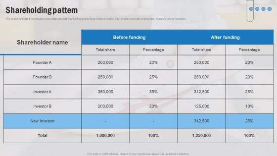 The slide highlights the company ownership structure highlighting percentage of shareholders. Shareholders consists of investors, founders and co-founders. This modern and well-arranged Shareholding Pattern Footwear Company Funding Elevator Pitch Deck Sample Pdf provides lots of creative possibilities. It is very simple to customize and edit with the Powerpoint Software. Just drag and drop your pictures into the shapes. All facets of this template can be edited with Powerpoint, no extra software is necessary. Add your own material, put your images in the places assigned for them, adjust the colors, and then you can show your slides to the world, with an animated slide included. The slide highlights the company ownership structure highlighting percentage of shareholders. Shareholders consists of investors, founders and co-founders.