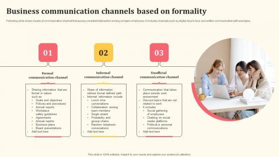 Following slide shows means of communication channel that assure consistent interaction among company employees. It includes channels such as digital, face to face and written communication with examples. Crafting an eye-catching presentation has never been more straightforward. Let your presentation shine with this tasteful yet straightforward Business Communication Channels Based On Formality Detailed Personnel Structure Pdf template. It offers a minimalistic and classy look that is great for making a statement. The colors have been employed intelligently to add a bit of playfulness while still remaining professional. Construct the ideal Business Communication Channels Based On Formality Detailed Personnel Structure Pdf that effortlessly grabs the attention of your audience. Begin now and be certain to wow your customers. Following slide shows means of communication channel that assure consistent interaction among company employees. It includes channels such as digital, face to face and written communication with examples.