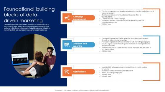 This slide represents the three key elements of marketing used by marketers to create unique and personalized experience for target customers. It includes details related to building block of data driven marketing which are campaign management, optimization etc.Create an editable Foundational Building Blocks Of Data Driven Guide For Data Driven Advertising Guidelines Pdf that communicates your idea and engages your audience. Whether you are presenting a business or an educational presentation, pre-designed presentation templates help save time. Foundational Building Blocks Of Data Driven Guide For Data Driven Advertising Guidelines Pdf is highly customizable and very easy to edit, covering many different styles from creative to business presentations. Slidegeeks has creative team members who have crafted amazing templates. So, go and get them without any delay. This slide represents the three key elements of marketing used by marketers to create unique and personalized experience for target customers. It includes details related to building block of data driven marketing which are campaign management, optimization etc.
