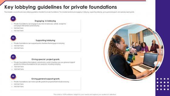 This template covers the advocacy lobbying guideline checklist for private foundations. The included sections are engaging in lobbying, supporting lobbying, giving general support, and special project grants. If your project calls for a presentation, then Slidegeeks is your go to partner because we have professionally designed, easy to edit templates that are perfect for any presentation. After downloading, you can easily edit Key Lobbying Guidelines For Private Foundations Not For Profit Venture Playbook Clipart Pdf and make the changes accordingly. You can rearrange slides or fill them with different images. Check out all the handy templates This template covers the advocacy lobbying guideline checklist for private foundations. The included sections are engaging in lobbying, supporting lobbying, giving general support, and special project grants.