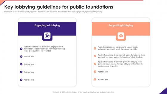 This template covers the advocacy lobbying guideline checklist for public foundations. The included sections are engaging in lobbying and supporting lobbying.Presenting Charitable Leadership Playbook For Policy Advocacy Key Lobbying Guidelines For Public Foundations Topics PDF to provide visual cues and insights. Share and navigate important information on one stage that need your due attention. This template can be used to pitch topics like Engaging Lobbying, Supporting Lobbying, Public Foundations. In addtion, this PPT design contains high resolution images, graphics, etc, that are easily editable and available for immediate download.