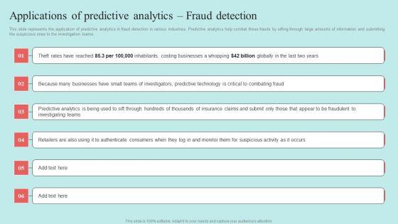 This slide represents the application of predictive analytics in fraud detection in various industries. Predictive analytics help combat these frauds by sifting through large amounts of information and submitting the suspicious ones to the investigation teams. Get a simple yet stunning designed Predictive Data Model Applications Of Predictive Analytics Fraud Detection Microsoft PDF. It is the best one to establish the tone in your meetings. It is an excellent way to make your presentations highly effective. So, download this PPT today from Slidegeeks and see the positive impacts. Our easy-to-edit Predictive Data Model Applications Of Predictive Analytics Fraud Detection Microsoft PDF can be your go-to option for all upcoming conferences and meetings. So, what are you waiting for Grab this template today.