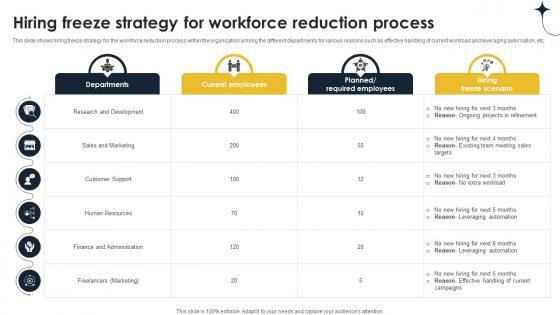 This slide shows hiring freeze strategy for the workforce reduction process within the organization among the different departments for various reasons such as effective handling of current workload and leveraging automation, etc. If you are looking for a format to display your unique thoughts, then the professionally designed Hiring Freeze Strategy For Workforce Reduction Implementing Personnel Downsizing Initiative is the one for you. You can use it as a Google Slides template or a PowerPoint template. Incorporate impressive visuals, symbols, images, and other charts. Modify or reorganize the text boxes as you desire. Experiment with shade schemes and font pairings. Alter, share or cooperate with other people on your work. Download Hiring Freeze Strategy For Workforce Reduction Implementing Personnel Downsizing Initiative and find out how to give a successful presentation. Present a perfect display to your team and make your presentation unforgettable. This slide shows hiring freeze strategy for the workforce reduction process within the organization among the different departments for various reasons such as effective handling of current workload and leveraging automation, etc.