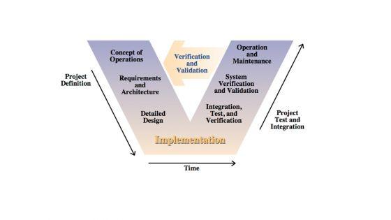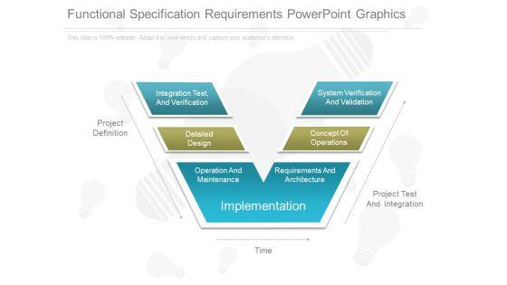 This is a functional specification requirements powerpoint graphics. This is a one stage process. The stages in this process are integration test and verification, detailed design, system verification and validation, concept of operations, operation and maintenance, requirements and architecture, implementation.