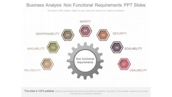 This is a business analysis non functional requirements ppt slides. This is a seven stage process. The stages in this process are reliability, availability, maintainability, safety, security, scalability, usability.