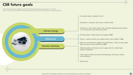 Following slide provides insights into environment improvement goals set by Apple Inc. for future years. It includes goals related to climate change, natural resources management, and smarter chemistry. Coming up with a presentation necessitates that the majority of the effort goes into the content and the message you intend to convey. The visuals of a PowerPoint presentation can only be effective if it supplements and supports the story that is being told. Keeping this in mind our experts created CSR Future Goals Consumer Electronics Company Profile CP SS V to reduce the time that goes into designing the presentation. This way, you can concentrate on the message while our designers take care of providing you with the right template for the situation. Following slide provides insights into environment improvement goals set by Apple Inc. for future years. It includes goals related to climate change, natural resources management, and smarter chemistry.