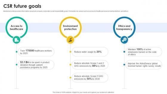 Mentioned slide provides information about set company corporate social responsibility goals. It includes key areas such as access to healthcare environment protection, and ethics. From laying roadmaps to briefing everything in detail, our templates are perfect for you. You can set the stage with your presentation slides. All you have to do is download these easy-to-edit and customizable templates. Csr Future Goals Medical Research And Development Company Profile CP SS V will help you deliver an outstanding performance that everyone would remember and praise you for. Do download this presentation today. Mentioned slide provides information about set company corporate social responsibility goals. It includes key areas such as access to healthcare environment protection, and ethics.