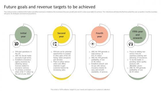 This slide provides a detailed information about the businesss milestone, the businesss five year growth plan and its sales assumption to achieve. The milestones will describe the forecasted five year projection, how the business will grow, its strategies and revenue projections. There are so many reasons you need a Future Goals And Revenue Insurance Agency Startup Business Plan Go To Market Strategy Diagrams Pdf. The first reason is you can not spend time making everything from scratch, Thus, Slidegeeks has made presentation templates for you too. You can easily download these templates from our website easily. This slide provides a detailed information about the businesss milestone, the businesss five year growth plan and its sales assumption to achieve. The milestones will describe the forecasted five year projection, how the business will grow, its strategies and revenue projections.