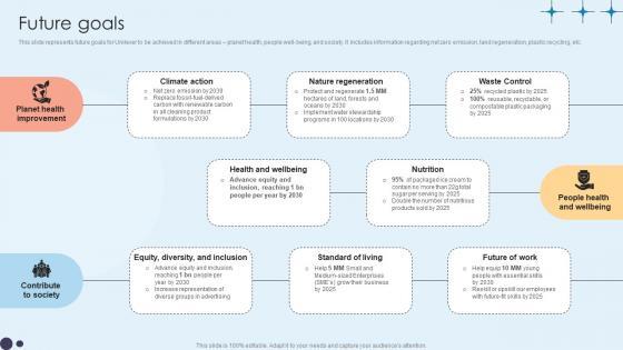 This slide represents future goals for Unilever to be achieved in different areas planet health, people well-being, and society. It includes information regarding net zero emission, land regeneration, plastic recycling, etc.Coming up with a presentation necessitates that the majority of the effort goes into the content and the message you intend to convey. The visuals of a PowerPoint presentation can only be effective if it supplements and supports the story that is being told. Keeping this in mind our experts created Future Goals Home Care Solutions Company Profile CP SS V to reduce the time that goes into designing the presentation. This way, you can concentrate on the message while our designers take care of providing you with the right template for the situation. This slide represents future goals for Unilever to be achieved in different areas planet health, people well-being, and society. It includes information regarding net zero emission, land regeneration, plastic recycling, etc.