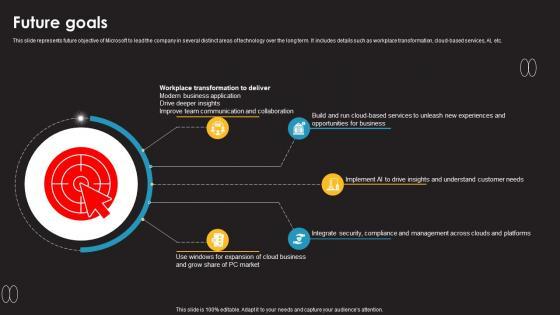 This slide represents future objective of Microsoft to lead the company in several distinct areas of technology over the long term. It includes details such as workplace transformation, cloud-based services, AI, etc.Whether you have daily or monthly meetings, a brilliant presentation is necessary. Future Goals Information Technology Services Provider Company Profile CP SS V can be your best option for delivering a presentation. Represent everything in detail using Future Goals Information Technology Services Provider Company Profile CP SS V and make yourself stand out in meetings. The template is versatile and follows a structure that will cater to your requirements. All the templates prepared by Slidegeeks are easy to download and edit. Our research experts have taken care of the corporate themes as well. So, give it a try and see the results. This slide represents future objective of Microsoft to lead the company in several distinct areas of technology over the long term. It includes details such as workplace transformation, cloud-based services, AI, etc.