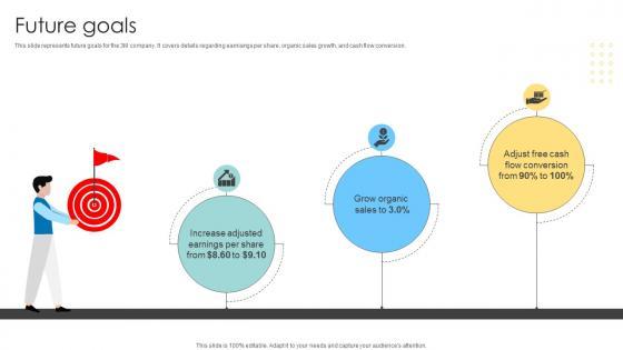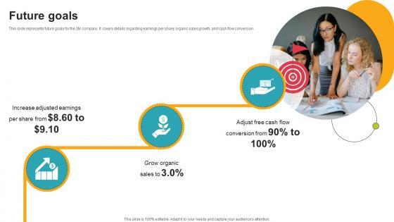 This slide represents future goals for the 3M company. It covers details regarding earnings per share, organic sales growth, and cash flow conversion.Slidegeeks is here to make your presentations a breeze with Future Goals Innovative Industrial Solutions Company Profile CP SS V With our easy-to-use and customizable templates, you can focus on delivering your ideas rather than worrying about formatting. With a variety of designs to choose from, you are sure to find one that suits your needs. And with animations and unique photos, illustrations, and fonts, you can make your presentation pop. So whether you are giving a sales pitch or presenting to the board, make sure to check out Slidegeeks first This slide represents future goals for the 3M company. It covers details regarding earnings per share, organic sales growth, and cash flow conversion.