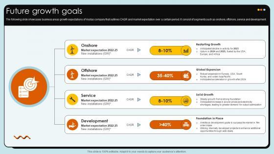 The following slide showcases business areas growth expectations of Vestas company that outlines CAGR and market expectation over a certain period. It consist of segments such as onshore, offshore, service and development.Whether you have daily or monthly meetings, a brilliant presentation is necessary. Future Growth Goals Wind Turbines Manufacturer Company Profile CP SS V can be your best option for delivering a presentation. Represent everything in detail using Future Growth Goals Wind Turbines Manufacturer Company Profile CP SS V and make yourself stand out in meetings. The template is versatile and follows a structure that will cater to your requirements. All the templates prepared by Slidegeeks are easy to download and edit. Our research experts have taken care of the corporate themes as well. So, give it a try and see the results. The following slide showcases business areas growth expectations of Vestas company that outlines CAGR and market expectation over a certain period. It consist of segments such as onshore, offshore, service and development.