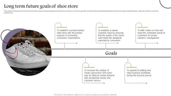 This slide showcases the shoe stores long term goals of expanding physical presence, driving e commerce growth, and becoming a leading destination for trendy and high quality footwear, catering to diverse customer preferences. Want to ace your presentation in front of a live audience Our Long Term Future Goals Company Analysis Of Shoe Store Sample Pdf can help you do that by engaging all the users towards you. Slidegeeks experts have put their efforts and expertise into creating these impeccable powerpoint presentations so that you can communicate your ideas clearly. Moreover, all the templates are customizable, and easy to edit and downloadable. Use these for both personal and commercial use. This slide showcases the shoe stores long term goals of expanding physical presence, driving e commerce growth, and becoming a leading destination for trendy and high quality footwear, catering to diverse customer preferences.