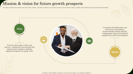 This slide summarizes the mission and vision of the company. This slides objective is to provide a concise overview of the company, together with its future goals and current growth prospects. Explore a selection of the finest Mission And Vision For Future Growth Prospects Landscaping Business Plan Ppt Template BP SS V here. With a plethora of professionally designed and pre-made slide templates, you can quickly and easily find the right one for your upcoming presentation. You can use our Mission And Vision For Future Growth Prospects Landscaping Business Plan Ppt Template BP SS V to effectively convey your message to a wider audience. Slidegeeks has done a lot of research before preparing these presentation templates. The content can be personalized and the slides are highly editable. Grab templates today from Slidegeeks. This slide summarizes the mission and vision of the company. This slides objective is to provide a concise overview of the company, together with its future goals and current growth prospects.