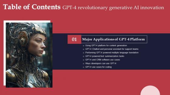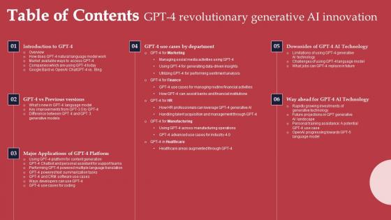 Are you searching for a Table Of Contents GPT 4 Revolutionary Generative AI Innovation Template Pdf that is uncluttered, straightforward, and original Its easy to edit, and you can change the colors to suit your personal or business branding. For a presentation that expresses how much effort you have put in, this template is ideal With all of its features, including tables, diagrams, statistics, and lists, its perfect for a business plan presentation. Make your ideas more appealing with these professional slides. Download Table Of Contents GPT 4 Revolutionary Generative AI Innovation Template Pdf from Slidegeeks today. Our Table Of Contents GPT 4 Revolutionary Generative AI Innovation Template Pdf are topically designed to provide an attractive backdrop to any subject. Use them to look like a presentation pro.