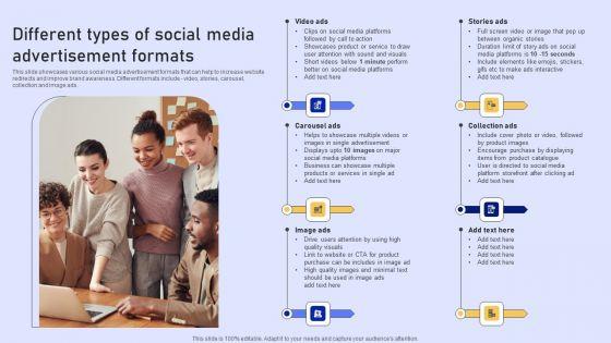 This slide showcases various social media advertisement formats that can help to increase website redirects and improve brand awareness. Different formats include - video, stories, carousel, collection and image ads. Do you know about Slidesgeeks Online Marketing Strategy For Lead Generation Different Types Of Social Media Advertisement Formats Background PDF These are perfect for delivering any kind od presentation. Using it, create PowerPoint presentations that communicate your ideas and engage audiences. Save time and effort by using our pre-designed presentation templates that are perfect for a wide range of topic. Our vast selection of designs covers a range of styles, from creative to business, and are all highly customizable and easy to edit. Download as a PowerPoint template or use them as Google Slides themes.