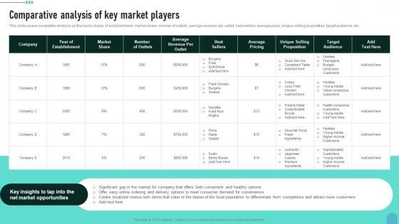 This slide covers competitor analysis on the basis of year of establishment, market share, number of outlets, average revenue per outlet, best sellers, average price, unique selling proposition, target audience, etc.Slidegeeks is here to make your presentations a breeze with Comparative Analysis Of Key Market Players Enhancing Global Presence Structure Pdf With our easy-to-use and customizable templates, you can focus on delivering your ideas rather than worrying about formatting. With a variety of designs to choose from, you are sure to find one that suits your needs. And with animations and unique photos, illustrations, and fonts, you can make your presentation pop. So whether you are giving a sales pitch or presenting to the board, make sure to check out Slidegeeks first. This slide covers competitor analysis on the basis of year of establishment, market share, number of outlets, average revenue per outlet, best sellers, average price, unique selling proposition, target audience, etc.