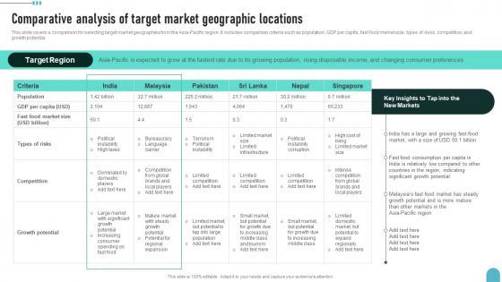This slide covers a comparison for selecting target market geographies from the Asia Pacific region. It includes comparison criteria such as population, GDP per capita, fast food market size, types of risks, competition, and growth potential.Do you have an important presentation coming up Are you looking for something that will make your presentation stand out from the rest Look no further than Comparative Analysis Of Target Market Enhancing Global Presence Sample Pdf. With our professional designs, you can trust that your presentation will pop and make delivering it a smooth process. And with Slidegeeks, you can trust that your presentation will be unique and memorable. So why wait Grab Comparative Analysis Of Target Market Enhancing Global Presence Sample Pdf today and make your presentation stand out from the rest. This slide covers a comparison for selecting target market geographies from the Asia Pacific region. It includes comparison criteria such as population, GDP per capita, fast food market size, types of risks, competition, and growth potential.