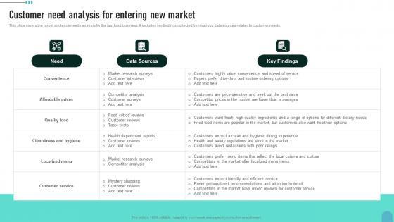 This slide covers the target audience needs analysis for the fast food business. It includes key findings collected from various data sources related to customer needs.Whether you have daily or monthly meetings, a brilliant presentation is necessary. Customer Need Analysis For Entering New Market Enhancing Global Presence Portrait Pdf can be your best option for delivering a presentation. Represent everything in detail using Customer Need Analysis For Entering New Market Enhancing Global Presence Portrait Pdf and make yourself stand out in meetings. The template is versatile and follows a structure that will cater to your requirements. All the templates prepared by Slidegeeks are easy to download and edit. Our research experts have taken care of the corporate themes as well. So, give it a try and see the results. This slide covers the target audience needs analysis for the fast food business. It includes key findings collected from various data sources related to customer needs.