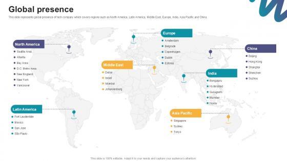 This slide represents global presence of tech company which covers regions such as North America, Latin America, Middle East, Europe, India, Asia Pacific and China. Are you in need of a template that can accommodate all of your creative concepts This one is crafted professionally and can be altered to fit any style. Use it with Google Slides or PowerPoint. Include striking photographs, symbols, depictions, and other visuals. Fill, move around, or remove text boxes as desired. Test out color palettes and font mixtures. Edit and save your work, or work with colleagues. Download Global Presence Digital Marketings Strategies PPT Template CP SS V and observe how to make your presentation outstanding. Give an impeccable presentation to your group and make your presentation unforgettable. This slide represents global presence of tech company which covers regions such as North America, Latin America, Middle East, Europe, India, Asia Pacific and China.