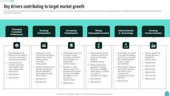 This slide covers key growth drivers of the fast food market. It includes factors such as changing consumer preferences, growing urbanization, increasing globalization, rising disposable incomes, advancements in technology, growing tourism industry.Coming up with a presentation necessitates that the majority of the effort goes into the content and the message you intend to convey. The visuals of a PowerPoint presentation can only be effective if it supplements and supports the story that is being told. Keeping this in mind our experts created Key Drivers Contributing To Target Market Enhancing Global Presence Mockup Pdf to reduce the time that goes into designing the presentation. This way, you can concentrate on the message while our designers take care of providing you with the right template for the situation. This slide covers key growth drivers of the fast food market. It includes factors such as changing consumer preferences, growing urbanization, increasing globalization, rising disposable incomes, advancements in technology, growing tourism industry.