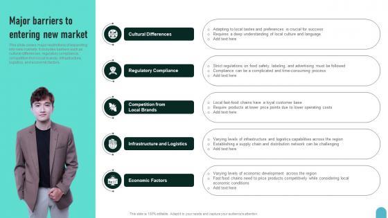 This slide covers major restrictions of expanding into new markets. It includes barriers such as cultural differences, regulatory compliance, competition from local brands, infrastructure, logistics, and economic factors.This modern and well-arranged Major Barriers To Entering New Market Enhancing Global Presence Elements Pdf provides lots of creative possibilities. It is very simple to customize and edit with the Powerpoint Software. Just drag and drop your pictures into the shapes. All facets of this template can be edited with Powerpoint no extra software is necessary. Add your own material, put your images in the places assigned for them, adjust the colors, and then you can show your slides to the world, with an animated slide included. This slide covers major restrictions of expanding into new markets. It includes barriers such as cultural differences, regulatory compliance, competition from local brands, infrastructure, logistics, and economic factors.