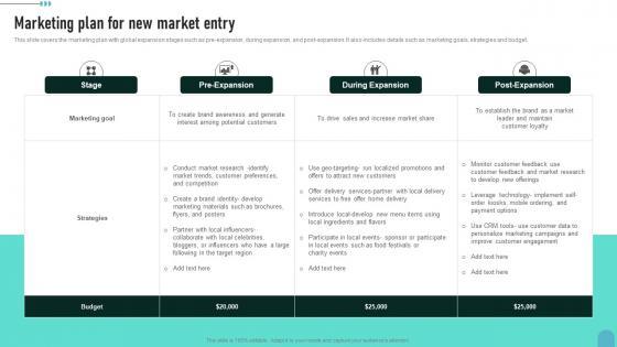 This slide covers the marketing plan with global expansion stages such as pre expansion, during expansion, and post expansion. It also includes details such as marketing goals, strategies and budget.The best PPT templates are a great way to save time, energy, and resources. Slidegeeks have 100Precent editable powerpoint slides making them incredibly versatile. With these quality presentation templates, you can create a captivating and memorable presentation by combining visually appealing slides and effectively communicating your message. Download Marketing Plan For New Market Entry Enhancing Global Presence Infographics Pdf from Slidegeeks and deliver a wonderful presentation. This slide covers the marketing plan with global expansion stages such as pre expansion, during expansion, and post expansion. It also includes details such as marketing goals, strategies and budget.