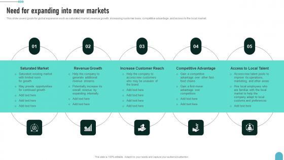 This slide covers goals for global expansion such as saturated market, revenue growth, increasing customer base, competitive advantage, and access to the local market.Are you searching for a Need For Expanding Into New Markets Enhancing Global Presence Introduction Pdf that is uncluttered, straightforward, and original Its easy to edit, and you can change the colors to suit your personal or business branding. For a presentation that expresses how much effort you have put in, this template is ideal. With all of its features, including tables, diagrams, statistics, and lists, its perfect for a business plan presentation. Make your ideas more appealing with these professional slides. Download Need For Expanding Into New Markets Enhancing Global Presence Introduction Pdf from Slidegeeks today. This slide covers goals for global expansion such as saturated market, revenue growth, increasing customer base, competitive advantage, and access to the local market.