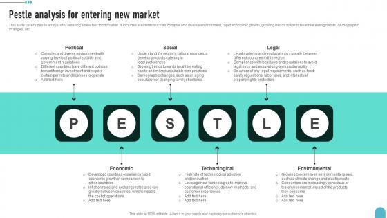 This slide covers pestle analysis for entering a new fast food market. It includes elements such as complex and diverse environment, rapid economic growth, growing trends towards healthier eating habits, demographic changes, etc.Presenting this PowerPoint presentation, titled Pestle Analysis For Entering New Market Enhancing Global Presence Pictures Pdf, with topics curated by our researchers after extensive research. This editable presentation is available for immediate download and provides attractive features when used. Download now and captivate your audience. Presenting this Pestle Analysis For Entering New Market Enhancing Global Presence Pictures Pdf. Our researchers have carefully researched and created these slides with all aspects taken into consideration. This is a completely customizable Pestle Analysis For Entering New Market Enhancing Global Presence Pictures Pdf that is available for immediate downloading. Download now and make an impact on your audience. Highlight the attractive features available with our PPTs. This slide covers pestle analysis for entering a new fast food market. It includes elements such as complex and diverse environment, rapid economic growth, growing trends towards healthier eating habits, demographic changes, etc.