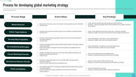 This slide covers steps for developing a global marketing strategy, such as market research, defining target audience, developing value proposition, developing marketing messaging, choosing marketing channels, setting goals and measuring results, etc. Do you know about Slidesgeeks Process For Developing Global Marketing Enhancing Global Presence Microsoft Pdf These are perfect for delivering any kind od presentation. Using it, create PowerPoint presentations that communicate your ideas and engage audiences. Save time and effort by using our pre-designed presentation templates that are perfect for a wide range of topic. Our vast selection of designs covers a range of styles, from creative to business, and are all highly customizable and easy to edit. Download as a PowerPoint template or use them as Google Slides themes. This slide covers steps for developing a global marketing strategy, such as market research, defining target audience, developing value proposition, developing marketing messaging, choosing marketing channels, setting goals and measuring results, etc.