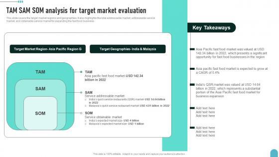 This slide covers the target market regions and geographies. It also highlights the total addressable market, addressable service market, and obtainable service market for expanding the fast food business.From laying roadmaps to briefing everything in detail, our templates are perfect for you. You can set the stage with your presentation slides. All you have to do is download these easy-to-edit and customizable templates. Tam Sam Som Analysis For Target Market Enhancing Global Presence Graphics Pdf will help you deliver an outstanding performance that everyone would remember and praise you for. Do download this presentation today. This slide covers the target market regions and geographies. It also highlights the total addressable market, addressable service market, and obtainable service market for expanding the fast food business.