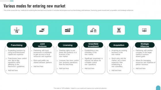 This slide covers the key methods for entering the new fast food market. It includes techniques such as franchising, joint ventures, licensing, green investment, acquisition, and strategic alliances.Do you have an important presentation coming up Are you looking for something that will make your presentation stand out from the rest Look no further than Various Modes For Entering New Market Enhancing Global Presence Structure Pdf. With our professional designs, you can trust that your presentation will pop and make delivering it a smooth process. And with Slidegeeks, you can trust that your presentation will be unique and memorable. So why wait Grab Various Modes For Entering New Market Enhancing Global Presence Structure Pdf today and make your presentation stand out from the rest. This slide covers the key methods for entering the new fast food market. It includes techniques such as franchising, joint ventures, licensing, green investment, acquisition, and strategic alliances.