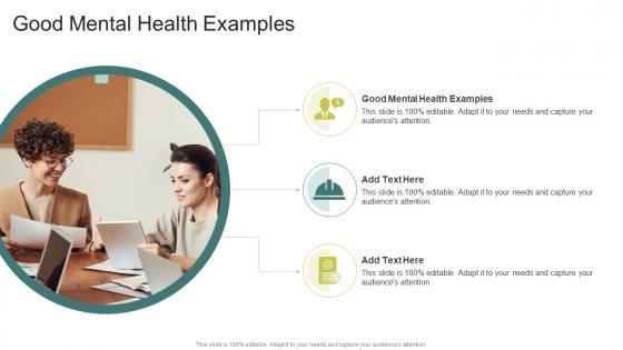 Presenting our innovatively designed set of slides titled Good Mental Health Examples In Powerpoint And Google Slides Cpb. This completely editable PowerPoint graphic exhibits Good Mental Health Examples that will help you convey the message impactfully. It can be accessed with Google Slides and is available in both standard screen and widescreen aspect ratios. Apart from this, you can download this well structured PowerPoint template design in different formats like PDF, JPG, and PNG. So, click the download button now to gain full access to this PPT design. Our Good Mental Health Examples In Powerpoint And Google Slides Cpb are topically designed to provide an attractive backdrop to any subject. Use them to look like a presentation pro.
