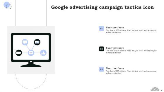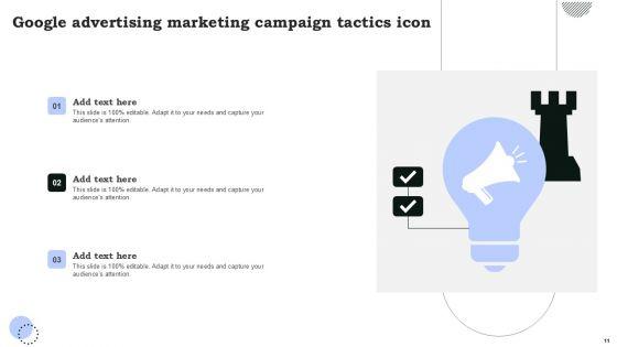 Boost your confidence and team morale with this well-structured Google Advertising Campaign Tactics Ppt PowerPoint Presentation Complete Deck With Slides. This prefabricated set gives a voice to your presentation because of its well-researched content and graphics. Our experts have added all the components very carefully, thus helping you deliver great presentations with a single click. Not only that, it contains a set of twelve slides that are designed using the right visuals, graphics, etc. Various topics can be discussed, and effective brainstorming sessions can be conducted using the wide variety of slides added in this complete deck. Apart from this, our PPT design contains clear instructions to help you restructure your presentations and create multiple variations. The color, format, design anything can be modified as deemed fit by the user. Not only this, it is available for immediate download. So, grab it now.