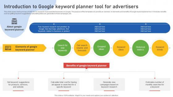 This slide covers brief summary of GKP tool to research most searched keywords on Google. The purpose of this template is to provide an overview on elements and benefits of Google keyword planner tool. It includes benefits such as getting keyword suggestions, calculating total cost, generation of new campaigns, etc. Slidegeeks is here to make your presentations a breeze with Google Ads Categories Introduction To Google Keyword Planner Tool For Advertisers MKT SS V With our easy-to-use and customizable templates, you can focus on delivering your ideas rather than worrying about formatting. With a variety of designs to choose from, you are sure to find one that suits your needs. And with animations and unique photos, illustrations, and fonts, you can make your presentation pop. So whether you are giving a sales pitch or presenting to the board, make sure to check out Slidegeeks first This slide covers brief summary of GKP tool to research most searched keywords on Google. The purpose of this template is to provide an overview on elements and benefits of Google keyword planner tool. It includes benefits such as getting keyword suggestions, calculating total cost, generation of new campaigns, etc.