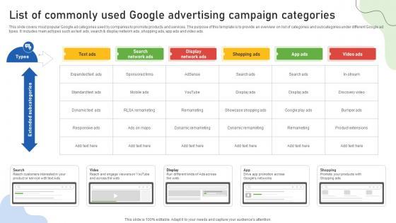 This slide covers most popular Google ad categories used by companies to promote products and services. The purpose of this template is to provide an overview on list of categories and subcategories under different Google ad types. It includes main ad types such as text ads, search and display network ads, shopping ads, app ads and video ads. Crafting an eye-catching presentation has never been more straightforward. Let your presentation shine with this tasteful yet straightforward Google Ads Categories List Of Commonly Used Google Advertising Campaign Categories MKT SS V template. It offers a minimalistic and classy look that is great for making a statement. The colors have been employed intelligently to add a bit of playfulness while still remaining professional. Construct the ideal Google Ads Categories List Of Commonly Used Google Advertising Campaign Categories MKT SS V that effortlessly grabs the attention of your audience Begin now and be certain to wow your customers This slide covers most popular Google ad categories used by companies to promote products and services. The purpose of this template is to provide an overview on list of categories and subcategories under different Google ad types. It includes main ad types such as text ads, search and display network ads, shopping ads, app ads and video ads.