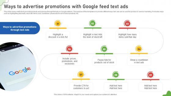 This slide covers methods to promote products and services through text ads on Google network. The purpose of this template is to provide different ways text ads can be used for product or service marketing. It includes ways such as highlighting discounts, stock left, items sold, countdown, pause ads for out-of-stock products, etc. Here you can discover an assortment of the finest PowerPoint and Google Slides templates. With these templates, you can create presentations for a variety of purposes while simultaneously providing your audience with an eye-catching visual experience. Download Google Ads Categories Ways To Advertise Promotions With Google Feed Text Ads MKT SS V to deliver an impeccable presentation. These templates will make your job of preparing presentations much quicker, yet still, maintain a high level of quality. Slidegeeks has experienced researchers who prepare these templates and write high-quality content for you. Later on, you can personalize the content by editing the Google Ads Categories Ways To Advertise Promotions With Google Feed Text Ads MKT SS V. This slide covers methods to promote products and services through text ads on Google network. The purpose of this template is to provide different ways text ads can be used for product or service marketing. It includes ways such as highlighting discounts, stock left, items sold, countdown, pause ads for out-of-stock products, etc.